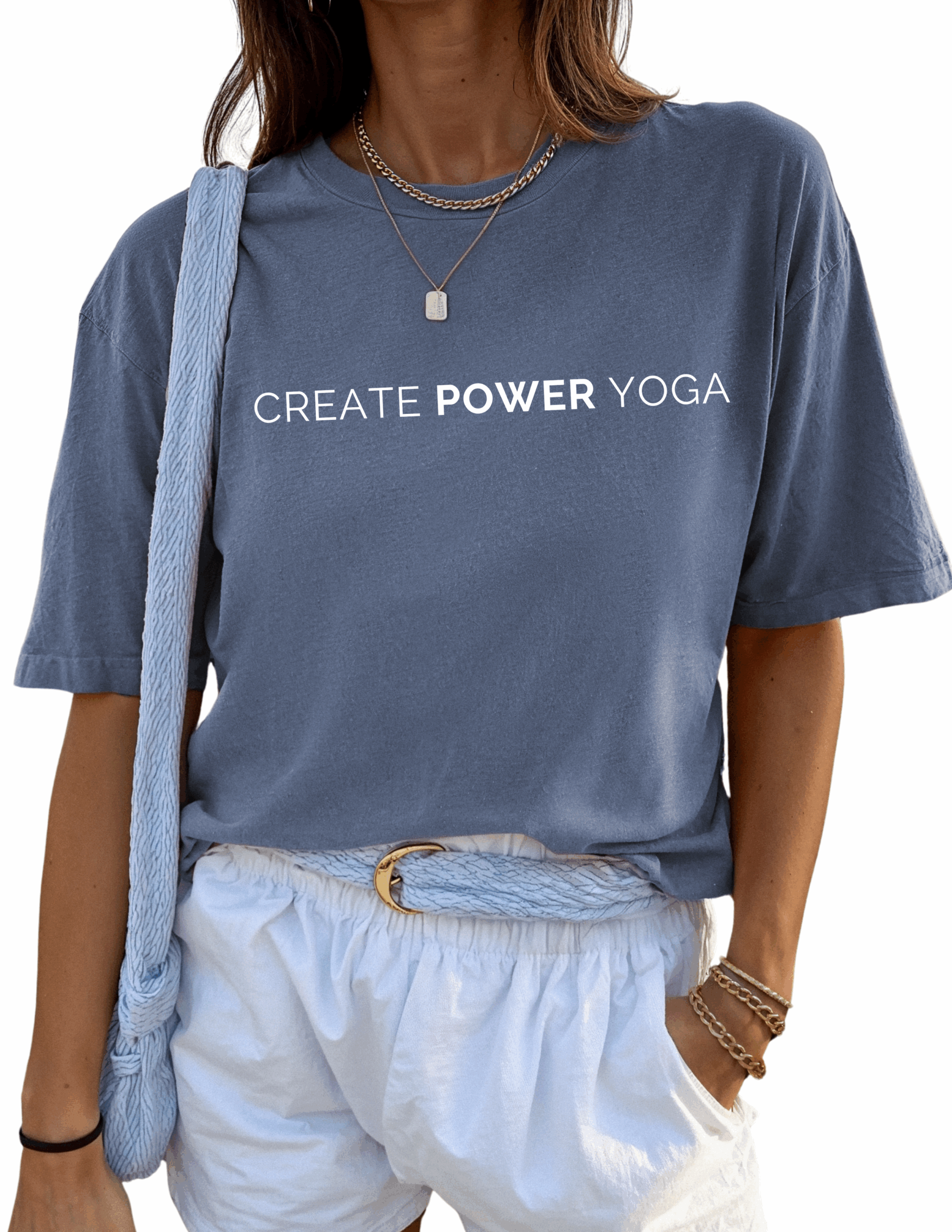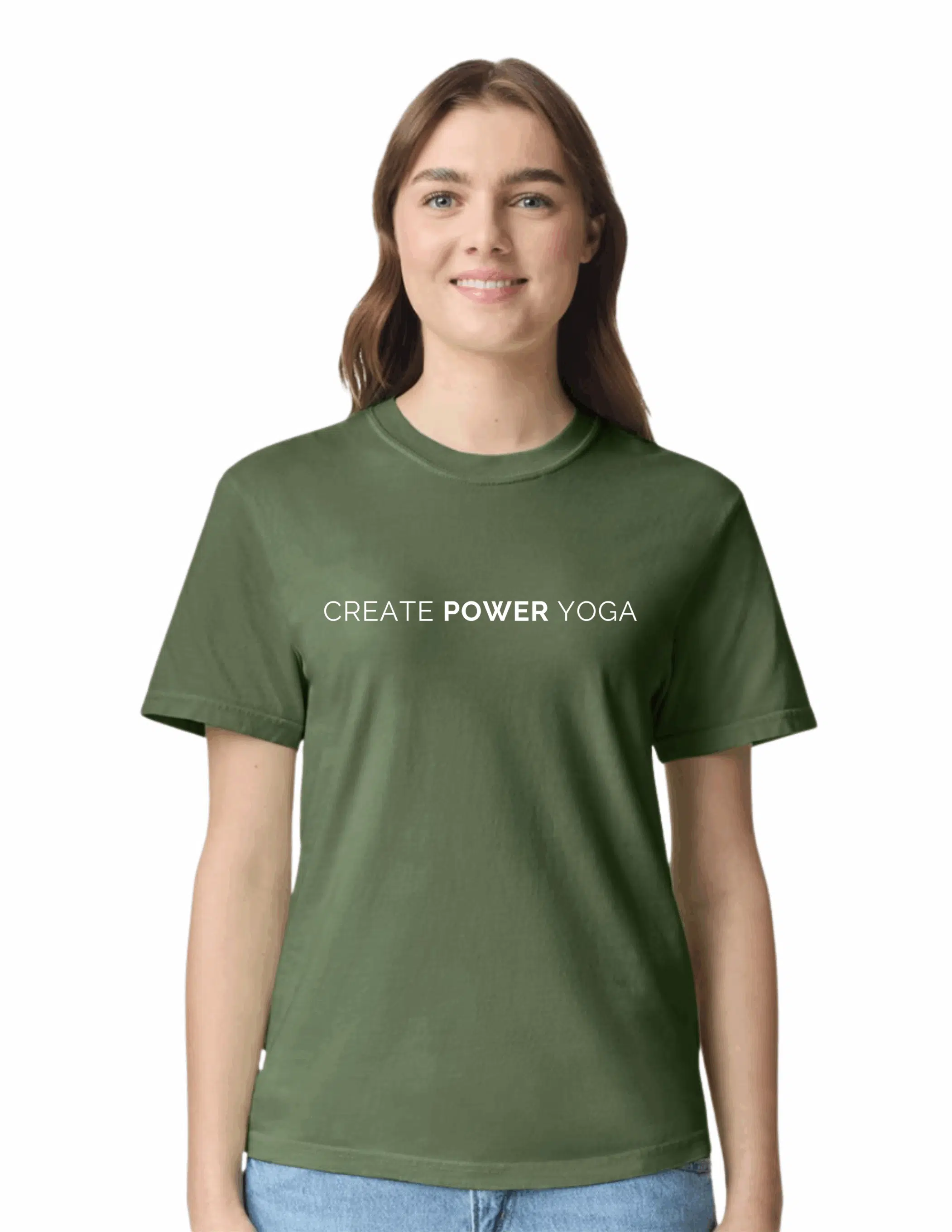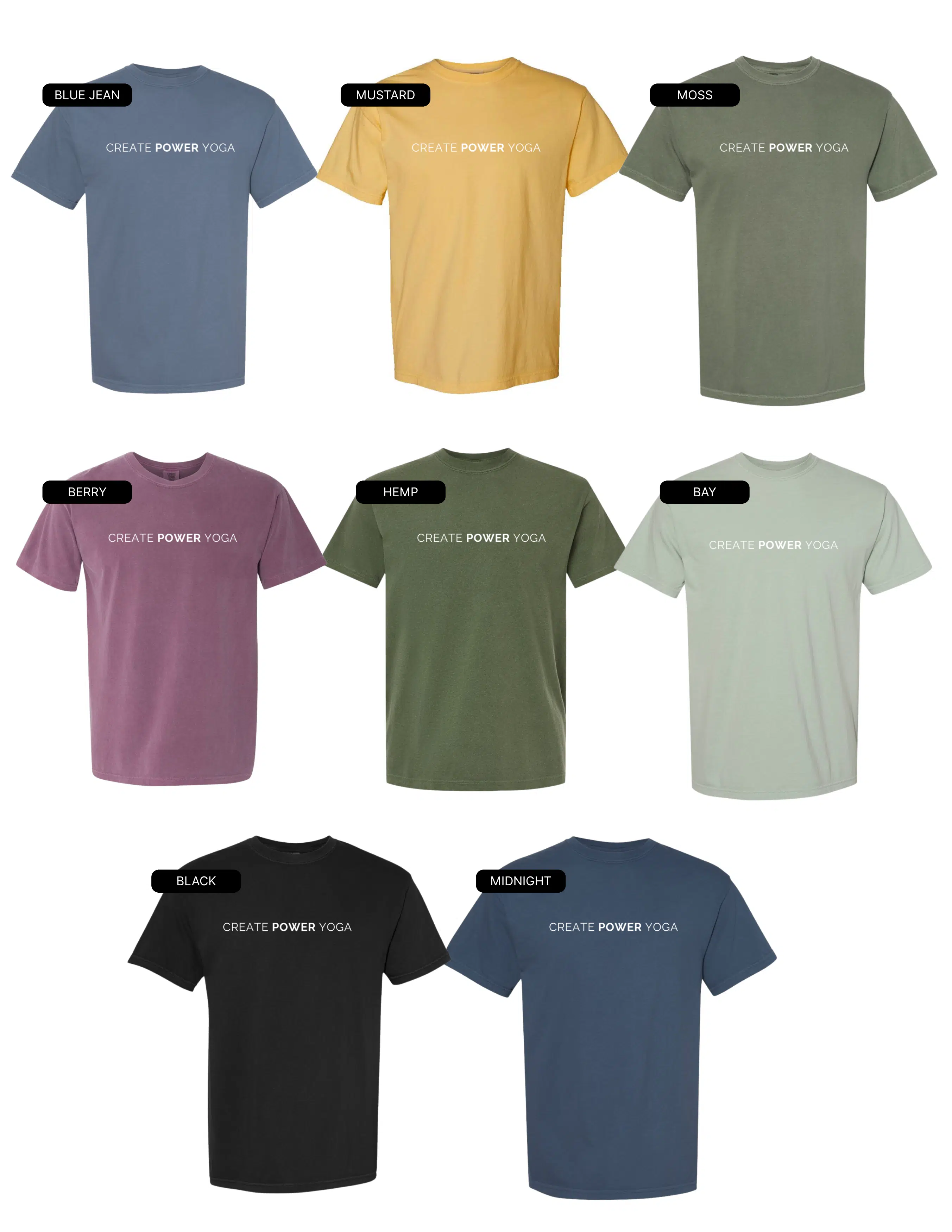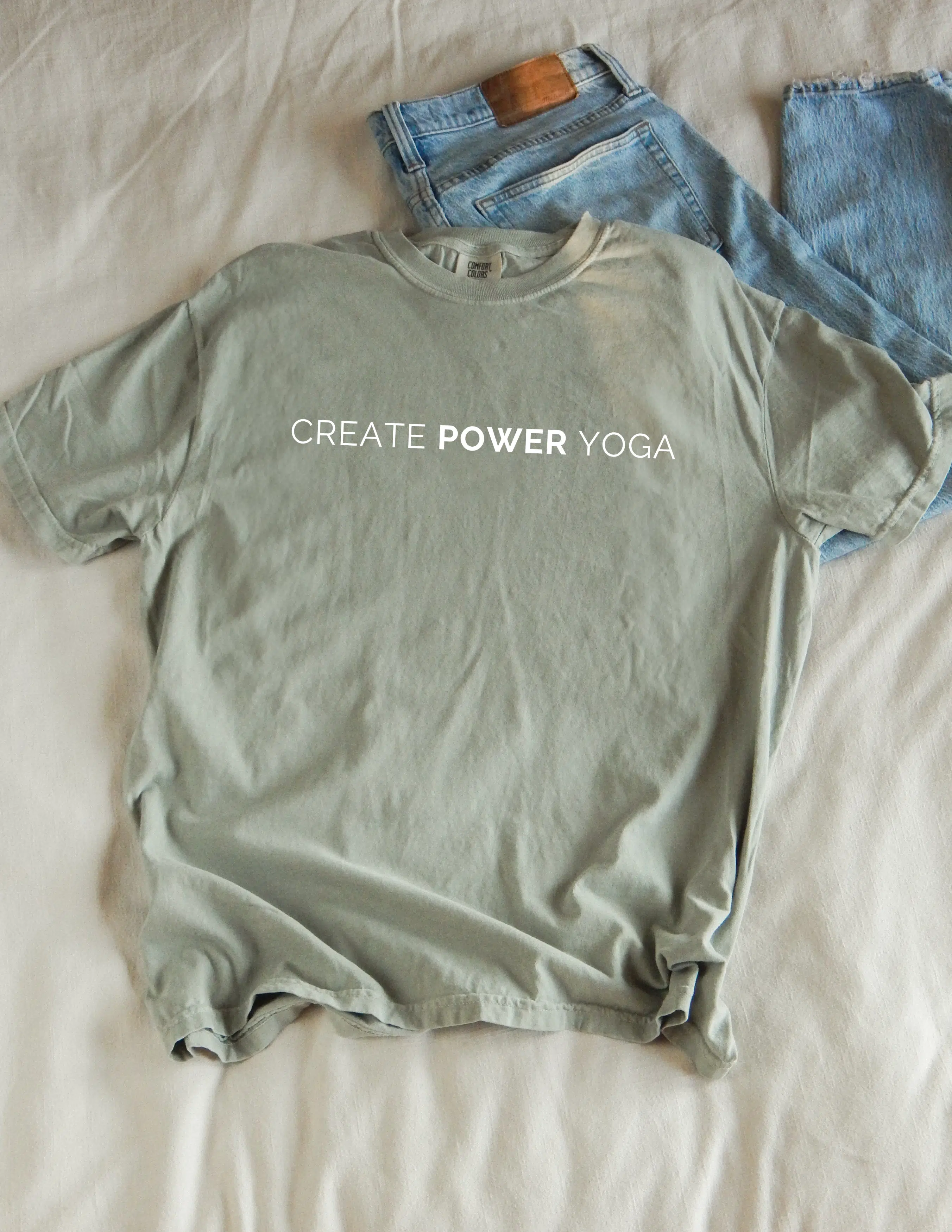 This T is soft and comfy, and screen printed with our classic Create Power Yoga logo.